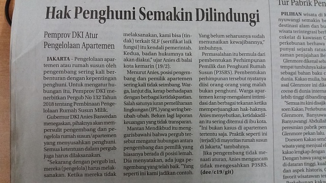 Read MorePengelolaan Apartemen atau rumah susun oleh pengembang sering kali berbenturan dengan kepentingan penghuni. Untuk mengatur hubungan itu, Pemprov DKI..